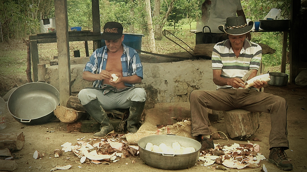 En los territorios colectivos que le pertenecen, la Comunidad produce cacao, caña, y cultivos de pancoger que satisfacen las necesidades alimenticias diarias. Entre los atropellos que ha vivido la Comunidad de Paz están los bloqueos económicos, impuestos por los grupos armados en la zona. Estos armaban retenes en las trochas hacia las veredas y las tierras de cultivo, prohibiendo el paso de alimentos o de cualquier mercancía, bajo amenaza de muerte. Esta situación, que tuvo su momentos más crítico durante la primera década de la existencia de la Comunidad de Paz, causó la muerte a decenas de campesinos y campesinas de la zona, quienes fueron asesinados por arriesgarse a salir a comprar comida. Estas fueron épocas de terror y mucha hambre. Hoy, el trabajo en el campo está basado en un modelo de soberanía alimentaria, que incluye la recuperación de semillas autóctonas de la zona y la exportación de cacao bajo los estándares de comercio justo a varios países de Europa. La Comunidad tiene grupos de trabajo comunitarios y días de trabajo comunitario en las tierras que le pertenecen, que no sólo tienen como objetivo cultivar alimentos para ser autosostenibles sino que también es una forma de organizarse, de hacer presencia en las veredas y mostrar su unidad y resistencia ante los actores armados y económicos presentes en la zona10. Para la Comunidad de Paz de San José de Apartadó, el anhelo por poder vivir en paz está estrechamente ligado al derecho a la vida y a la tierra. Germán Garciano Posso, representante legal de la Comunidad, explica: “El derecho a vivir implica respeto, acceso a la tierra, al agua, a la salud… Proteger la vida para nosotros significa tener el derecho a vivir como queremos – y que esto no lo determinen los poderes políticos y económicos por nosotros”11.